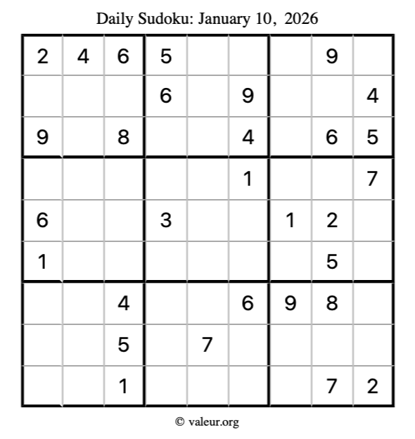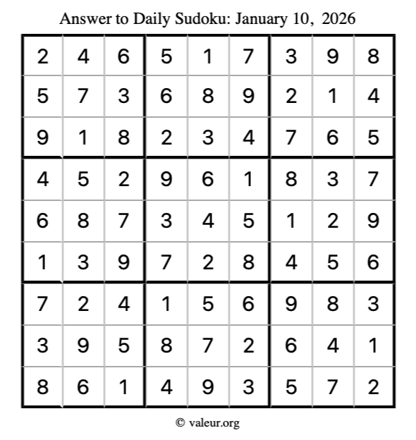 Here is the January 10, 2026 sudoku puzzle. You are welcome to print a copy to solve by hand. For your convenience, we have also included the solution further down the page so you can check your work.