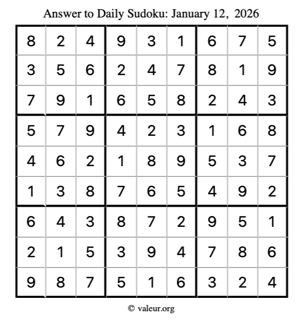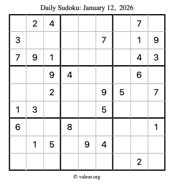 Here is the January 12, 2026 sudoku puzzle. You are welcome to print a copy to solve by hand. For your convenience, we have also included the solution further down the page so you can check your work.