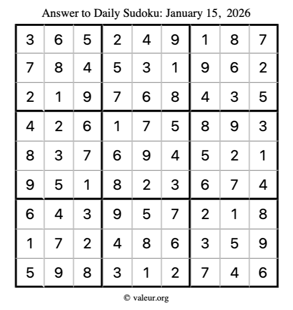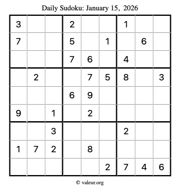 Here is the January 15, 2026 sudoku puzzle. You are welcome to print a copy to solve by hand. For your convenience, we have also included the solution further down the page so you can check your work.