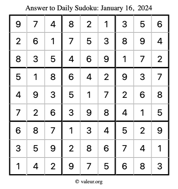 Here is the January 16, 2024 sudoku puzzle. You are welcome to print a copy to solve by hand. For your convenience, we have also included the solution further down the page so you can check your work.