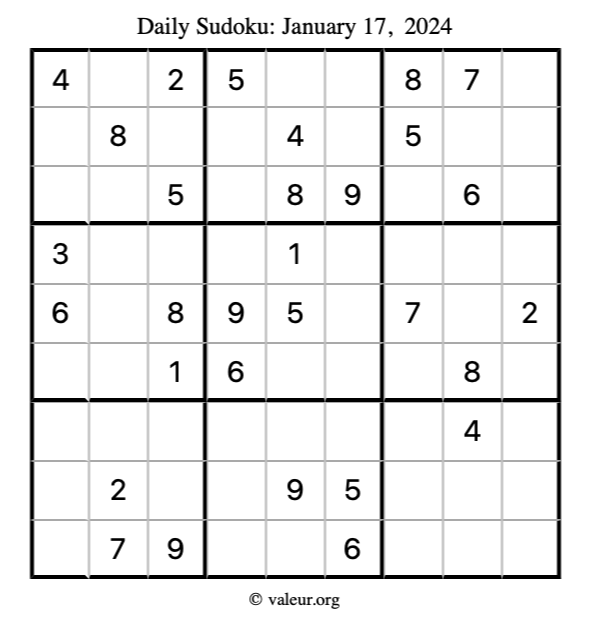 Here is the January 17, 2024 sudoku puzzle. You are welcome to print a copy to solve by hand. For your convenience, we have also included the solution further down the page so you can check your work.