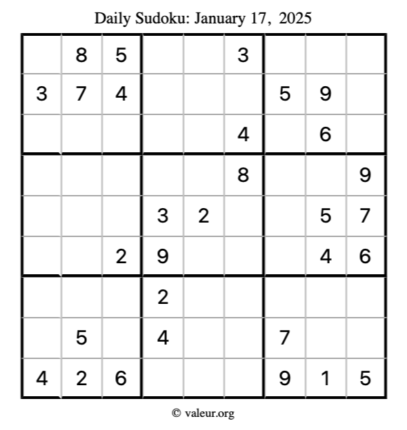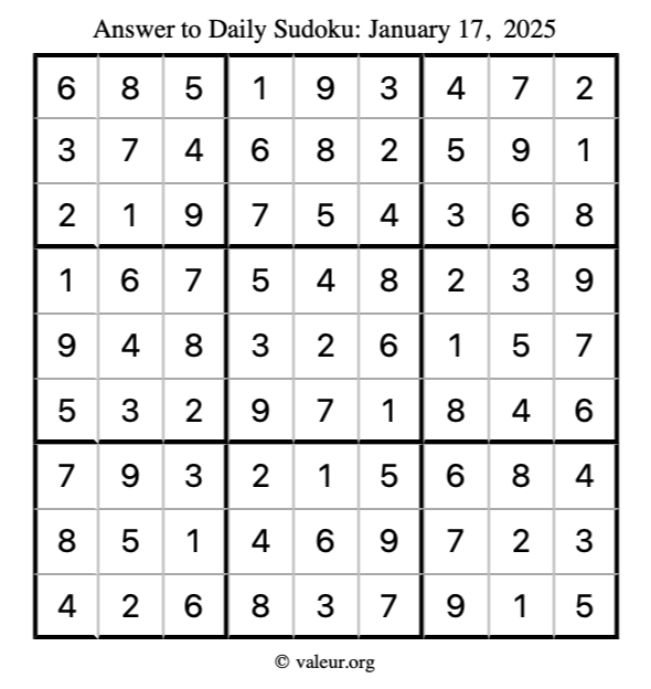 Here is the January 17, 2025 sudoku puzzle. You are welcome to print a copy to solve by hand. For your convenience, we have also included the solution further down the page so you can check your work.
