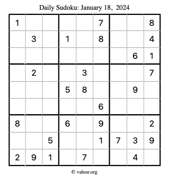 Here is the January 18, 2024 sudoku puzzle. You are welcome to print a copy to solve by hand. For your convenience, we have also included the solution further down the page so you can check your work.