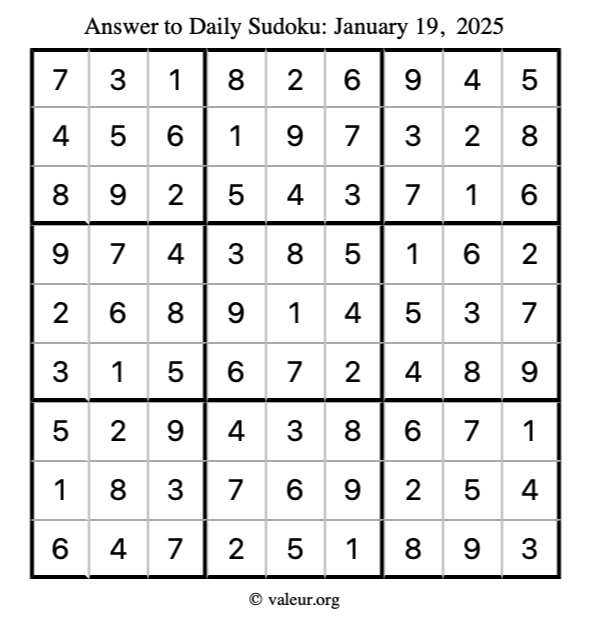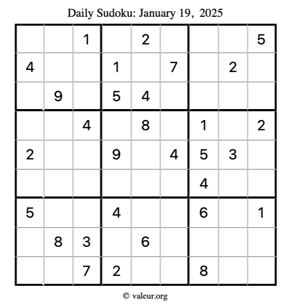 Here is the January 19, 2025 sudoku puzzle. You are welcome to print a copy to solve by hand. For your convenience, we have also included the solution further down the page so you can check your work.