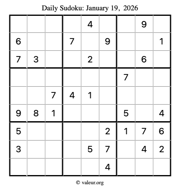 Here is the January 19, 2026 sudoku puzzle. You are welcome to print a copy to solve by hand. For your convenience, we have also included the solution further down the page so you can check your work.