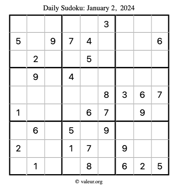 Here is the January 2, 2024 sudoku puzzle. You are welcome to print a copy to solve by hand. For your convenience, we have also included the solution further down the page so you can check your work.