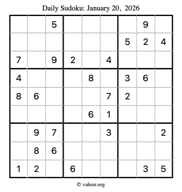 Here is the January 20, 2026 sudoku puzzle. You are welcome to print a copy to solve by hand. For your convenience, we have also included the solution further down the page so you can check your work.