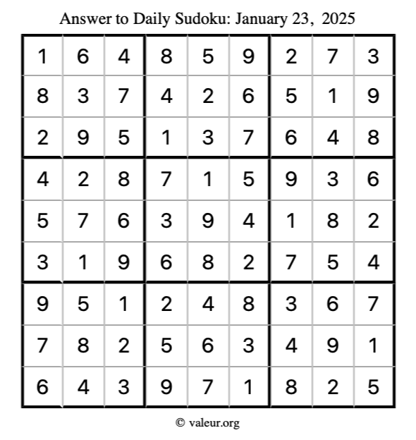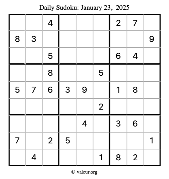 Here is the January 23, 2025 sudoku puzzle. You are welcome to print a copy to solve by hand. For your convenience, we have also included the solution further down the page so you can check your work.