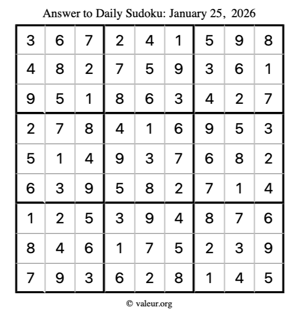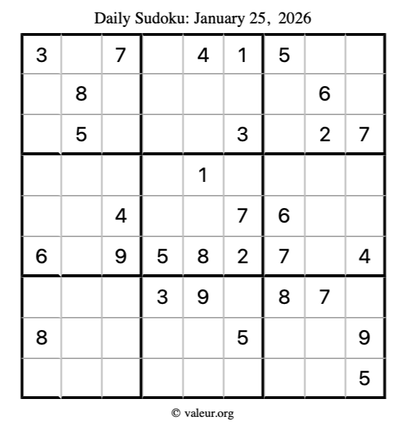 Here is the January 25, 2026 sudoku puzzle. You are welcome to print a copy to solve by hand. For your convenience, we have also included the solution further down the page so you can check your work.