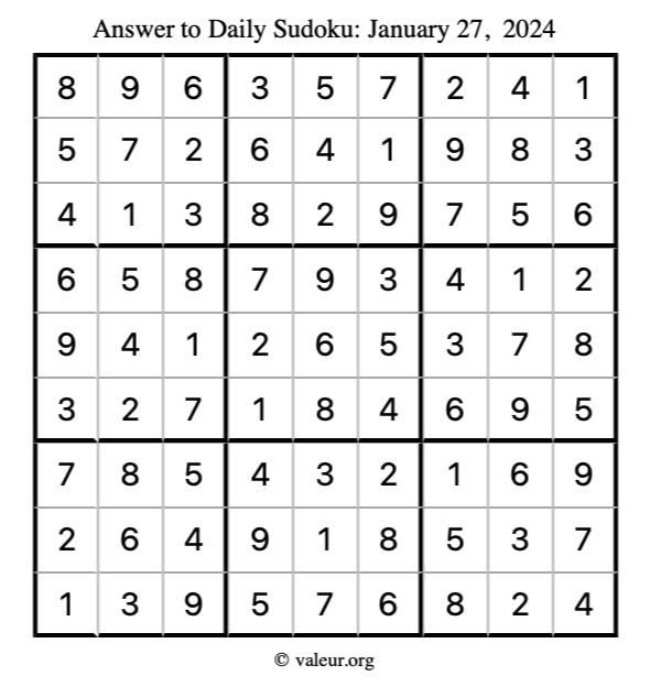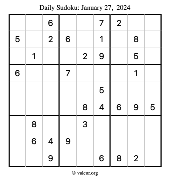 Here is the January 27, 2024 sudoku puzzle. You are welcome to print a copy to solve by hand. For your convenience, we have also included the solution further down the page so you can check your work.