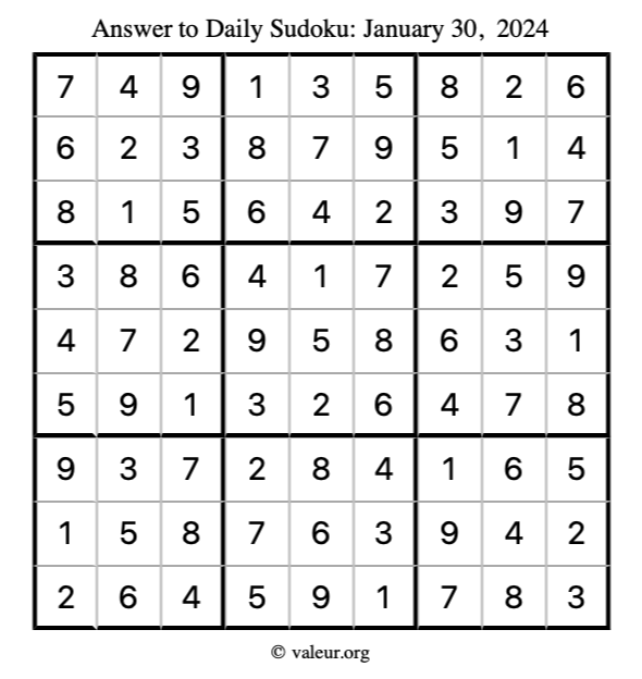Here is the January 30, 2024 sudoku puzzle. You are welcome to print a copy to solve by hand. For your convenience, we have also included the solution further down the page so you can check your work.