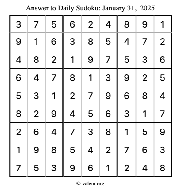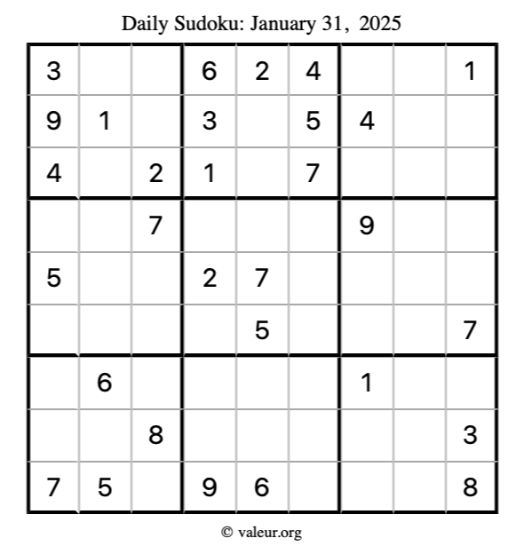 Here is the January 31, 2025 sudoku puzzle. You are welcome to print a copy to solve by hand. For your convenience, we have also included the solution further down the page so you can check your work.