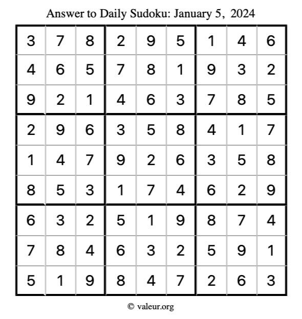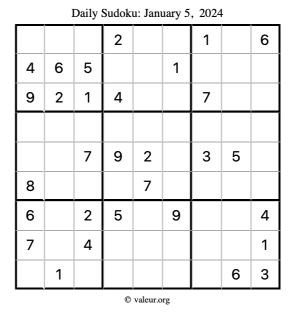 Here is the January 5, 2024 sudoku puzzle. You are welcome to print a copy to solve by hand. For your convenience, we have also included the solution further down the page so you can check your work.