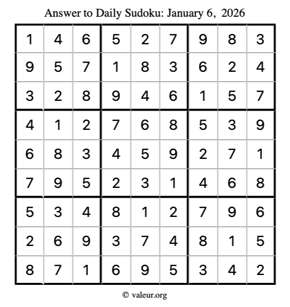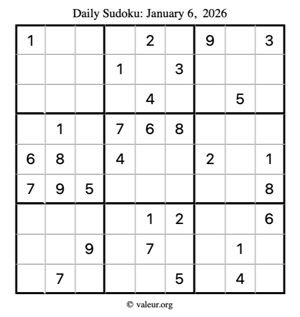 Here is the January 6, 2026 sudoku puzzle. You are welcome to print a copy to solve by hand. For your convenience, we have also included the solution further down the page so you can check your work.