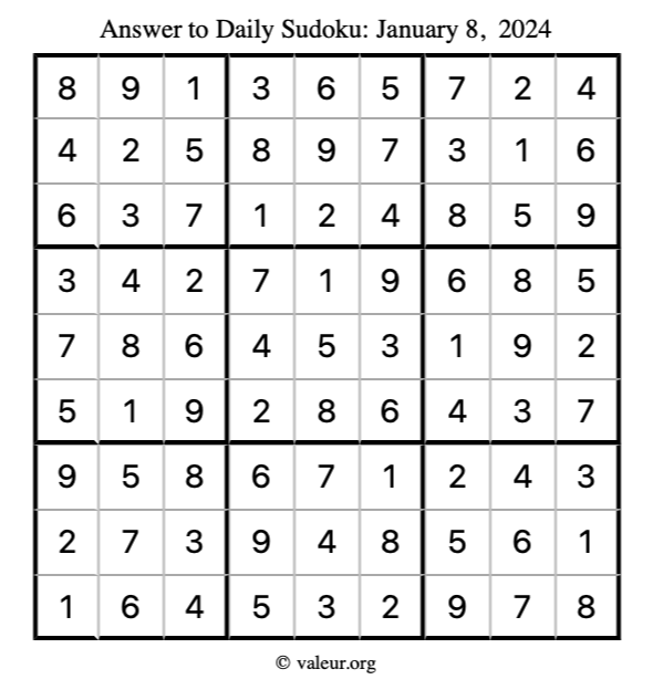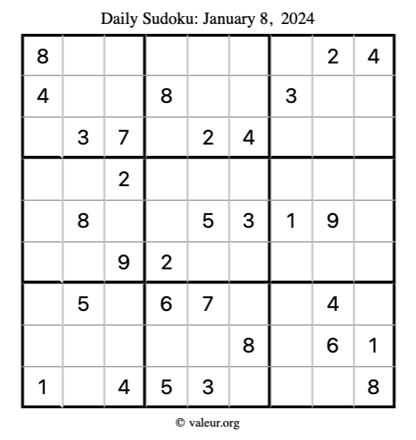 Here is the January 8, 2024 sudoku puzzle. You are welcome to print a copy to solve by hand. For your convenience, we have also included the solution further down the page so you can check your work.