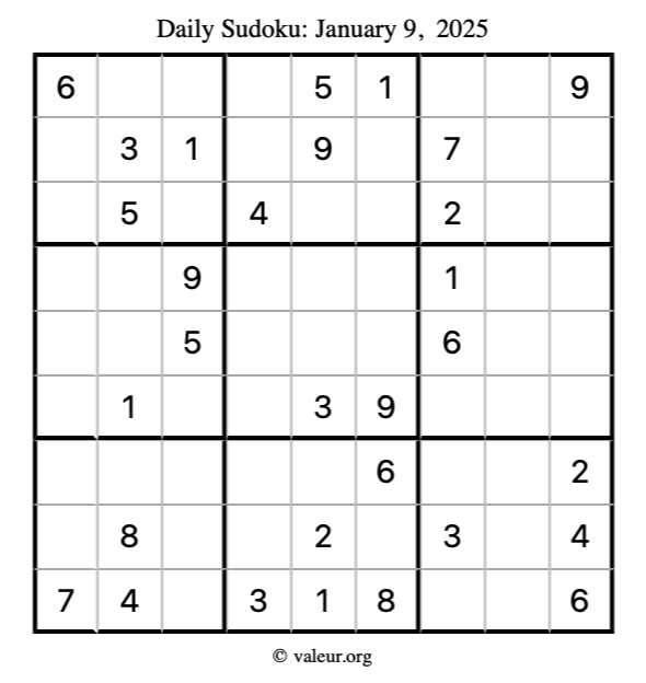 Here is the January 9, 2025 sudoku puzzle. You are welcome to print a copy to solve by hand. For your convenience, we have also included the solution further down the page so you can check your work.