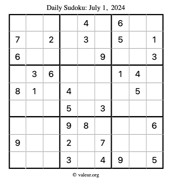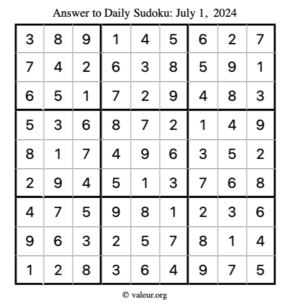 Here is the July 1, 2024 sudoku puzzle. You are welcome to print a copy to solve by hand. For your convenience, we have also included the solution further down the page so you can check your work.