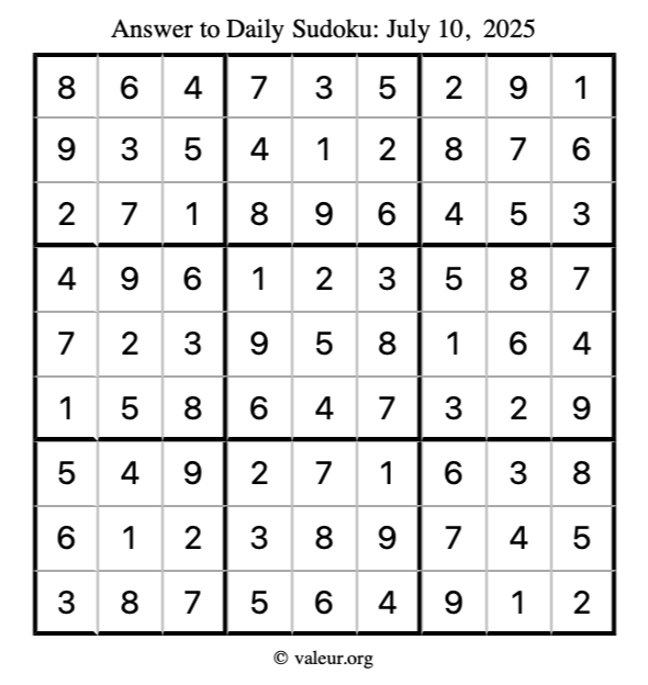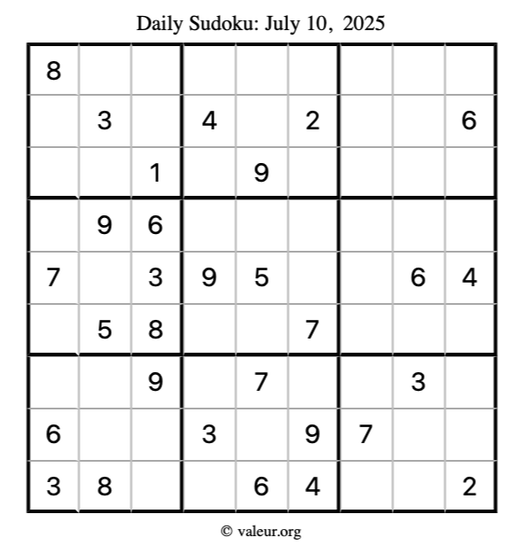 Here is the July 10, 2025 sudoku puzzle. You are welcome to print a copy to solve by hand. For your convenience, we have also included the solution further down the page so you can check your work.