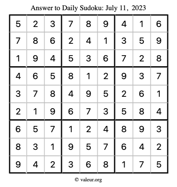 Here is the July 11, 2023 sudoku puzzle. You are welcome to print a copy to solve by hand. For your convenience, we have also included the solution further down the page so you can check your work.