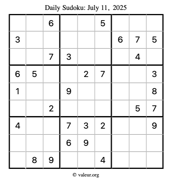 Here is the July 11, 2025 sudoku puzzle. You are welcome to print a copy to solve by hand. For your convenience, we have also included the solution further down the page so you can check your work.