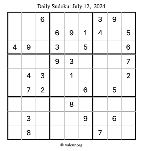 Here is the July 12, 2024 sudoku puzzle. You are welcome to print a copy to solve by hand. For your convenience, we have also included the solution further down the page so you can check your work.