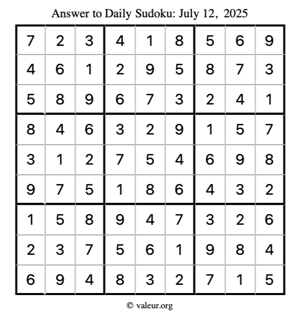 Here is the July 12, 2025 sudoku puzzle. You are welcome to print a copy to solve by hand. For your convenience, we have also included the solution further down the page so you can check your work.
