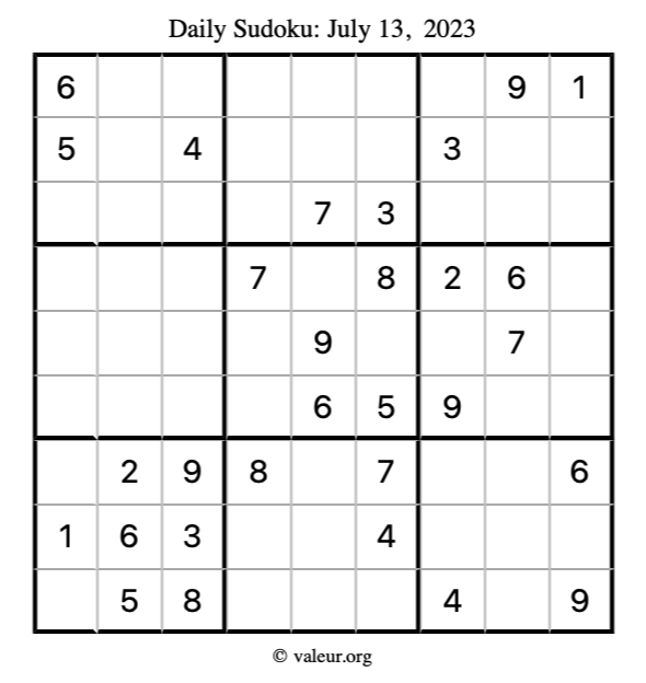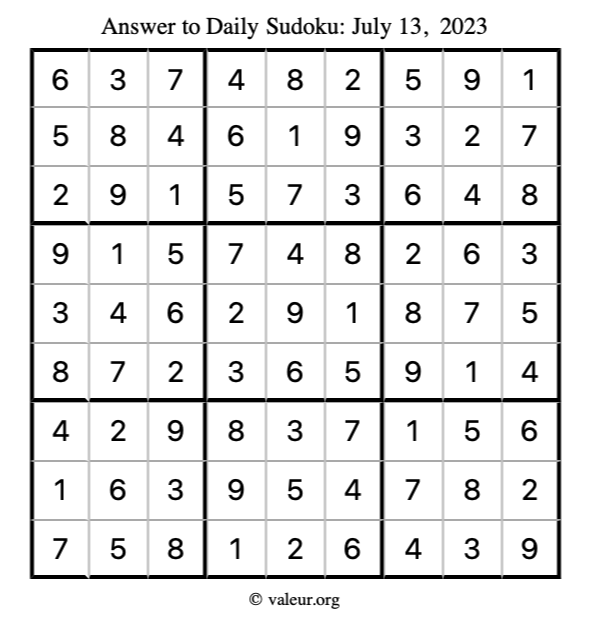 Here is the July 13, 2023 sudoku puzzle. You are welcome to print a copy to solve by hand. For your convenience, we have also included the solution further down the page so you can check your work.