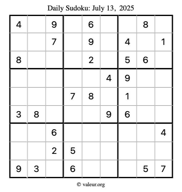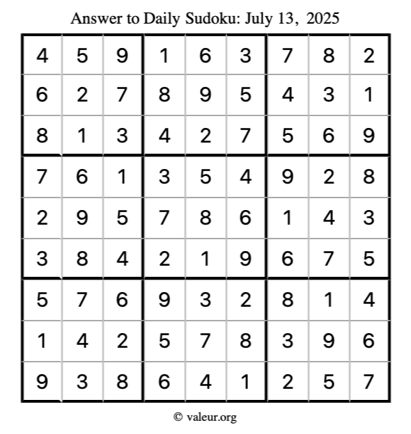 Here is the July 13, 2025 sudoku puzzle. You are welcome to print a copy to solve by hand. For your convenience, we have also included the solution further down the page so you can check your work.