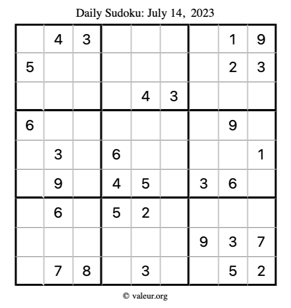Here is the July 14, 2023 sudoku puzzle. You are welcome to print a copy to solve by hand. For your convenience, we have also included the solution further down the page so you can check your work.