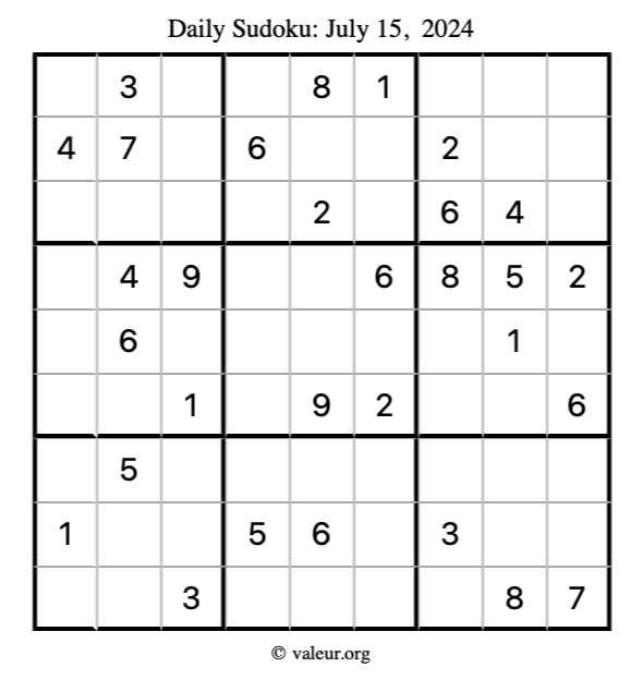 Here is the July 15, 2024 sudoku puzzle. You are welcome to print a copy to solve by hand. For your convenience, we have also included the solution further down the page so you can check your work.