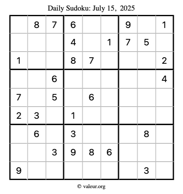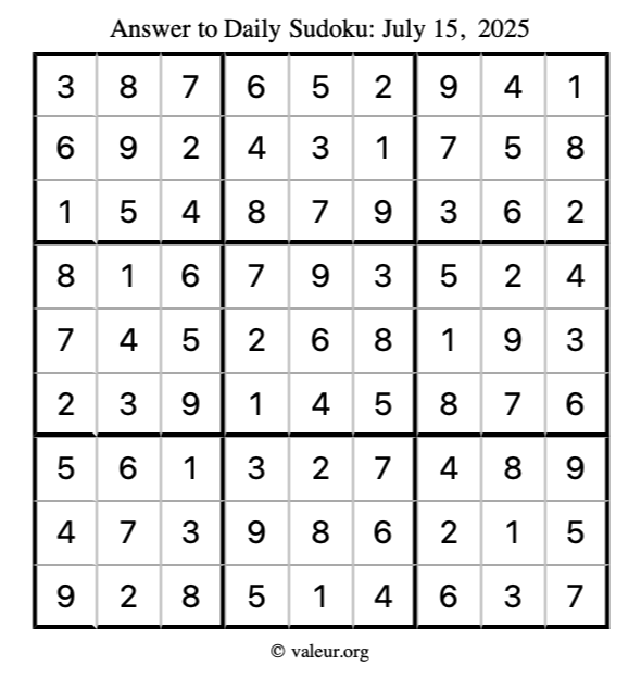 Here is the July 15, 2025 sudoku puzzle. You are welcome to print a copy to solve by hand. For your convenience, we have also included the solution further down the page so you can check your work.