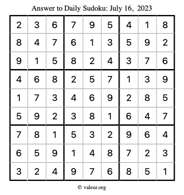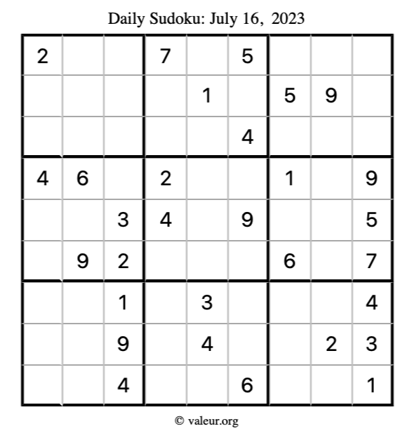 Here is the July 16, 2023 sudoku puzzle. You are welcome to print a copy to solve by hand. For your convenience, we have also included the solution further down the page so you can check your work.