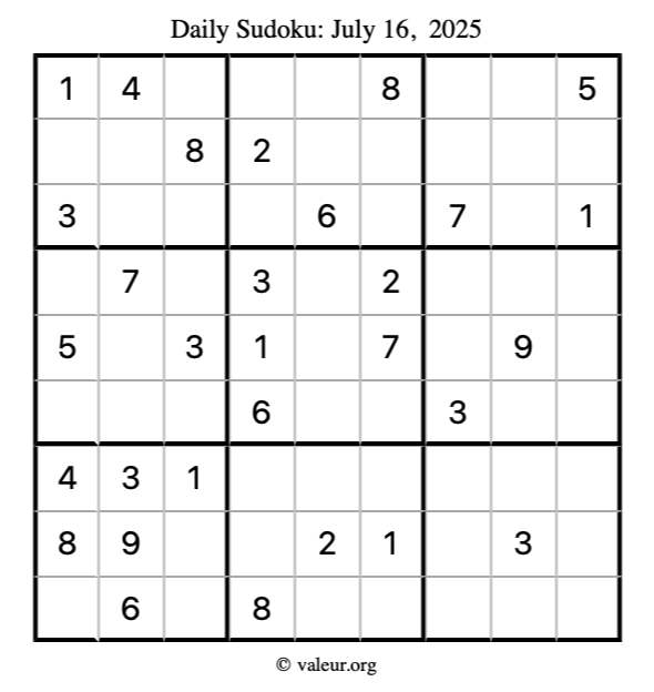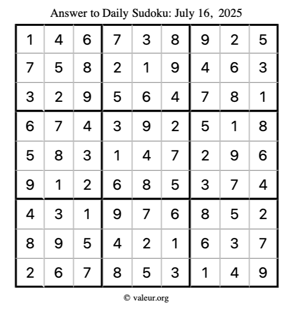 Here is the July 16, 2025 sudoku puzzle. You are welcome to print a copy to solve by hand. For your convenience, we have also included the solution further down the page so you can check your work.