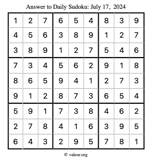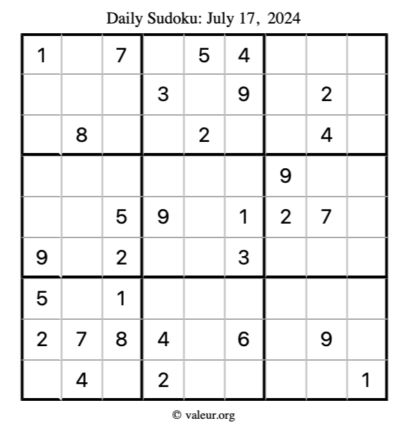Here is the July 17, 2024 sudoku puzzle. You are welcome to print a copy to solve by hand. For your convenience, we have also included the solution further down the page so you can check your work.