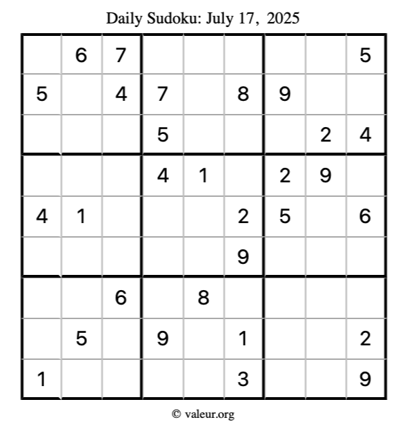 Here is the July 17, 2025 sudoku puzzle. You are welcome to print a copy to solve by hand. For your convenience, we have also included the solution further down the page so you can check your work.