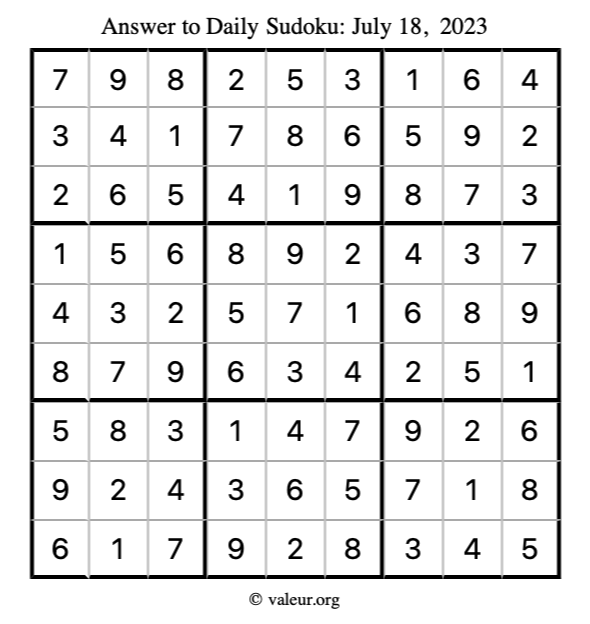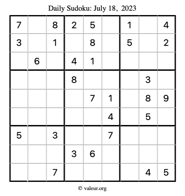 Here is the July 18, 2023 sudoku puzzle. You are welcome to print a copy to solve by hand. For your convenience, we have also included the solution further down the page so you can check your work.