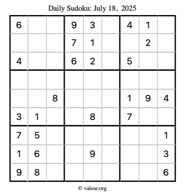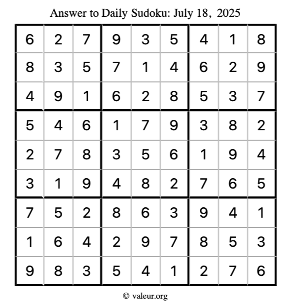 Here is the July 18, 2025 sudoku puzzle. You are welcome to print a copy to solve by hand. For your convenience, we have also included the solution further down the page so you can check your work.