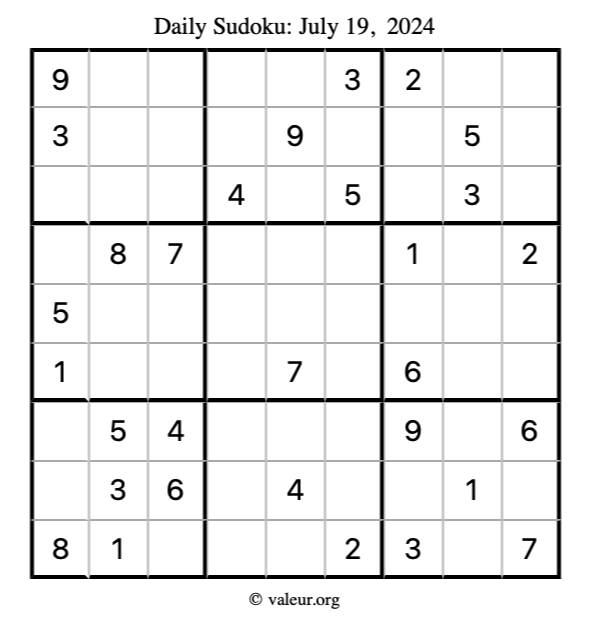 Here is the July 19, 2024 sudoku puzzle. You are welcome to print a copy to solve by hand. For your convenience, we have also included the solution further down the page so you can check your work.