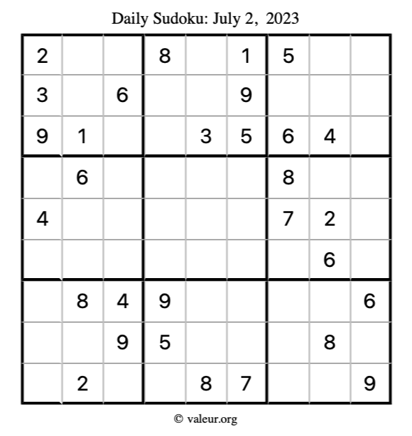 Here is the July 2, 2023 sudoku puzzle. You are welcome to print a copy to solve by hand. For your convenience, we have also included the solution further down the page so you can check your work.