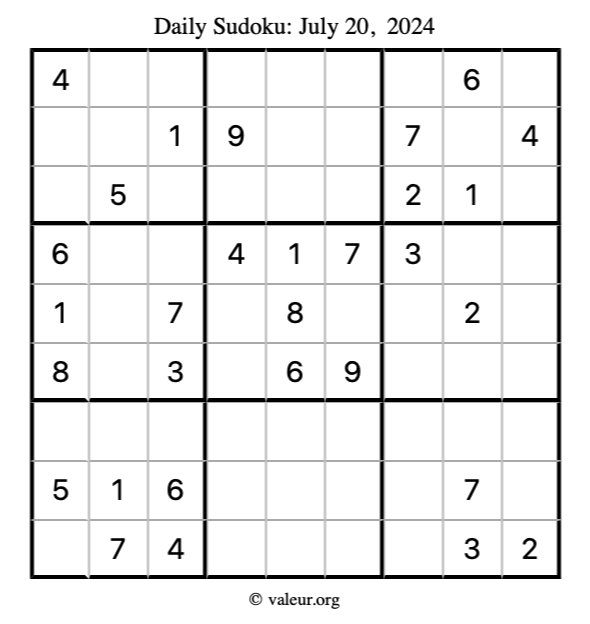 Here is the July 20, 2024 sudoku puzzle. You are welcome to print a copy to solve by hand. For your convenience, we have also included the solution further down the page so you can check your work.