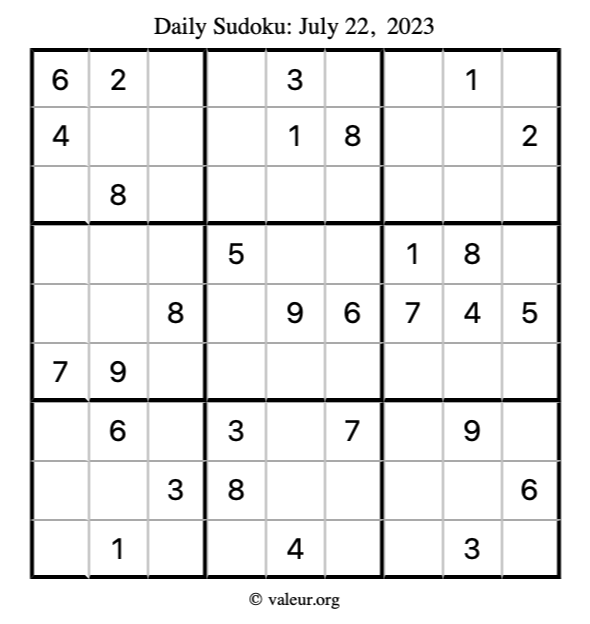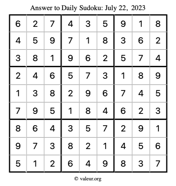 Here is the July 22, 2023 sudoku puzzle. You are welcome to print a copy to solve by hand. For your convenience, we have also included the solution further down the page so you can check your work.