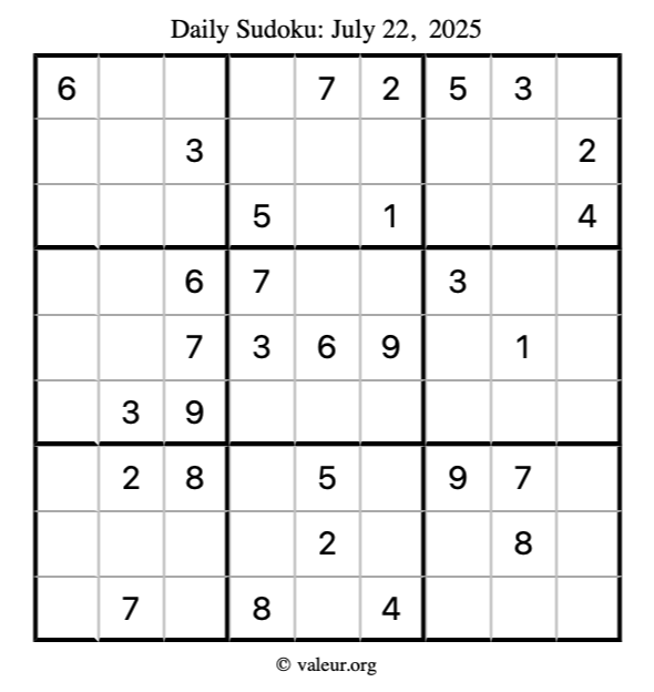 Here is the July 22, 2025 sudoku puzzle. You are welcome to print a copy to solve by hand. For your convenience, we have also included the solution further down the page so you can check your work.