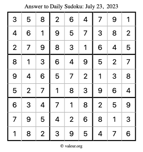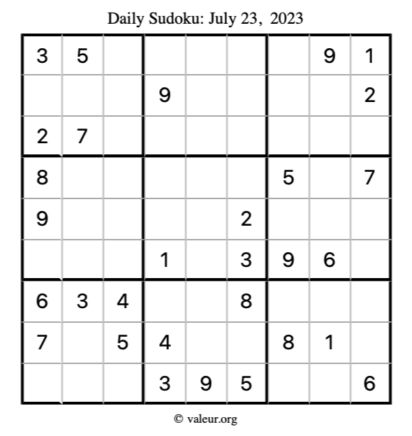 Here is the July 23, 2023 sudoku puzzle. You are welcome to print a copy to solve by hand. For your convenience, we have also included the solution further down the page so you can check your work.