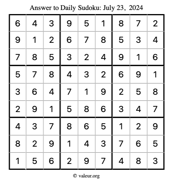 Here is the July 23, 2024 sudoku puzzle. You are welcome to print a copy to solve by hand. For your convenience, we have also included the solution further down the page so you can check your work.