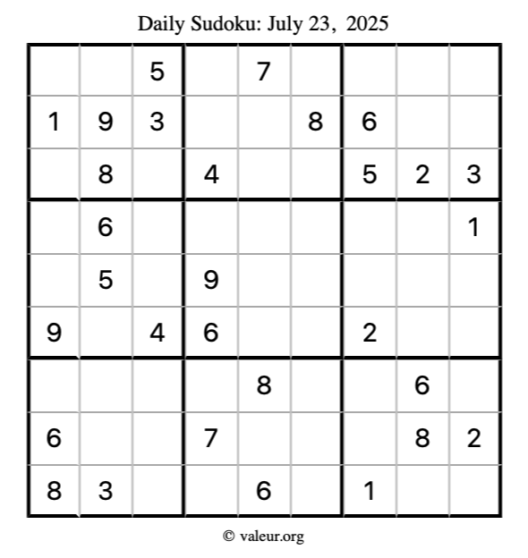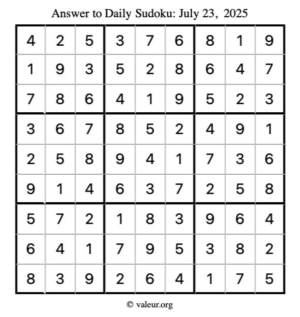 Here is the July 23, 2025 sudoku puzzle. You are welcome to print a copy to solve by hand. For your convenience, we have also included the solution further down the page so you can check your work.