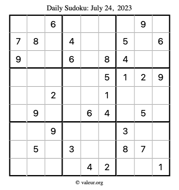 Here is the July 24, 2023 sudoku puzzle. You are welcome to print a copy to solve by hand. For your convenience, we have also included the solution further down the page so you can check your work.