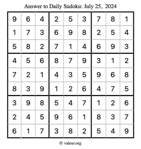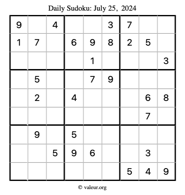 Here is the July 25, 2024 sudoku puzzle. You are welcome to print a copy to solve by hand. For your convenience, we have also included the solution further down the page so you can check your work.