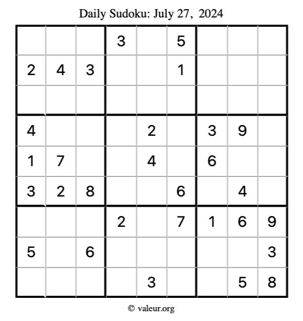 Here is the July 27, 2024 sudoku puzzle. You are welcome to print a copy to solve by hand. For your convenience, we have also included the solution further down the page so you can check your work.