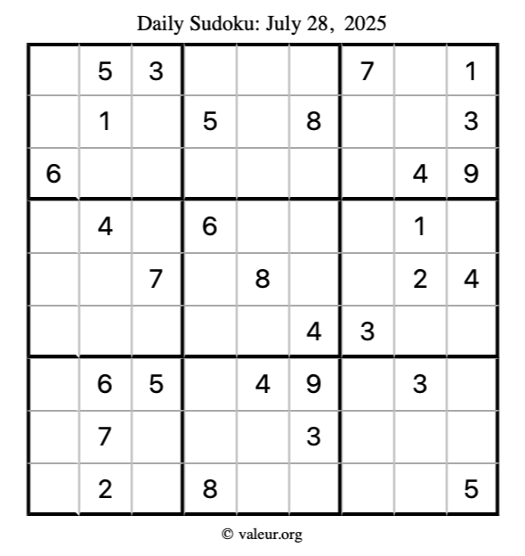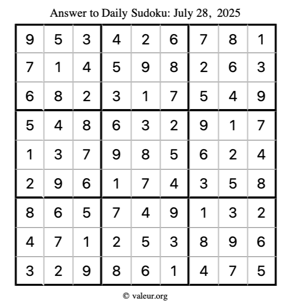 Here is the July 28, 2025 sudoku puzzle. You are welcome to print a copy to solve by hand. For your convenience, we have also included the solution further down the page so you can check your work.