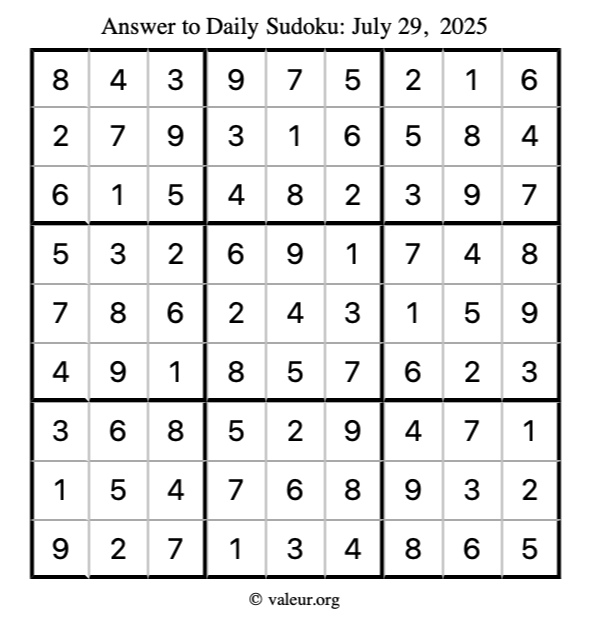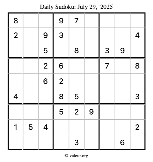Here is the July 29, 2025 sudoku puzzle. You are welcome to print a copy to solve by hand. For your convenience, we have also included the solution further down the page so you can check your work.